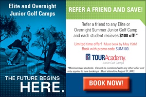 Full Day Junior Camp - Boys and girls, ages 9-16, all skill levels. Price includes all golf activities, lunch daily and a TOURAcademy camp amenity package. Full day camps are week long, 9:00 A.M. to 4:00 P.M., Monday-Friday commuter programs. Student to teacher ratio is 6:1.